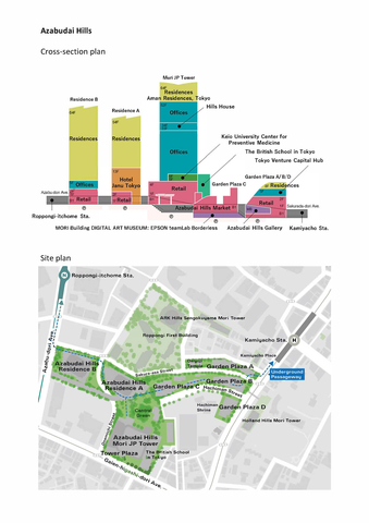 วิสัยทัศน์ของ Mori Building สำหรับ Azabudai Hills คือการปรับเปลี่ยนให้กลายเป็นชุมชนแนวคิด “Green & Wellness” ตามมาตรฐานแห่งทศวรรษที่ 21 โดยผู้คนสามารถใช้ชีวิตร่วมกันกับธรรมชาติได้อย่างกลมกลืน Azabudai Hills ครอบคลุมพื้นที่ประมาณ 8.1 เฮกตาร์ มีพื้นที่ทั้งหมดประมาณ 861,700 ม.² รวมถึงพื้นที่สำนักงาน 214,500 ม.² พื้นที่สีเขียว 24,000 ม.² ที่พักอาศัย 1,400 ยูนิต ห้องพักในโรงแรม 122 ห้อง ตลอดจนร้านค้าปลีกและร้านอาหารประมาณ 150 แห่ง Mori JP Tower เพิ่มสูงขึ้นอีก 330 เมตร ทำให้กลายเป็นอาคารที่สูงที่สุดในญี่ปุ่น ย่าน “เมืองภายในเมือง” ที่ได้รับการปรับปรุงใหม่นี้จะต้อนรับพนักงานออฟฟิศประมาณ 20,000 คน และผู้อยู่อาศัย 3,500 คน เมื่อคนเต็ม และคาดว่าจะต้อนรับผู้มาเยือน 30 ล้านคนต่อปี