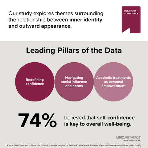 Merz Aesthetics ธุรกิจเวชศาสตร์ทางทางการแพทย์ที่ใหญ่ที่สุดในโลก ได้ประกาศผลการวิจัยระดับโลกครั้งแรกในวันนี้ เสาหลักแห่งความมั่นใจ (Pillars of Confidence): ข้อมูลเชิงลึกระดับโลกเกี่ยวกับความงามและความเชื่อมั่นในคุณค่าของตัวเอง การศึกษานี้ได้สำรวจบทบาทเกี่ยวกับความมั่นใจในชีวิตประจำวันและความเป็นอยู่โดยรวม รวมถึงความเชื่อมโยงระหว่างตัวตนภายในและการแสดงออกภายนอก