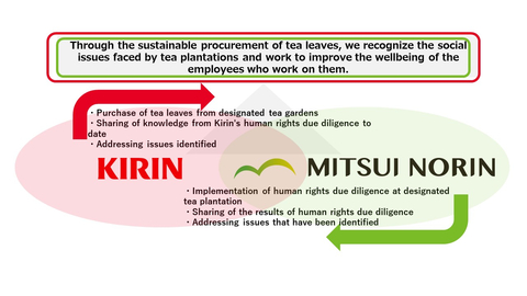 Kirin Group ดำเนินการตรวจสอบสิทธิมนุษยชนอย่างรอบด้าน*2ในห่วงโซ่อุปทานตั้งแต่ต้นน้ำจนถึงปลายน้ำตั้งแต่ปี 2018 ตามมาตรฐานสากล UN Guiding Principles on Business and Human Rights และนโยบายสิทธิมนุษยชนของ Kirin Group จนถึงขณะนี้ Kirin Group ได้ดำเนินการดังกล่าวในห่วงโซ่อุปทานของเมล็ดกาแฟในลาว ถั่วเหลืองในจีน ใบชาในศรีลังกา องุ่นในอาร์เจนตินา และอ้อยในบราซิล ประสบการณ์และความรู้ที่ได้รับจากโครงการริเริ่มเหล่านั้น จะถูกนำไปใช้ในความพยายามตรวจสอบสิทธิมนุษยชนอย่างรอบด้าน ร่วมกับ Mitsui Norin และปัญหาใดๆ ที่เกิดขึ้นจะได้รับการพิจารณาเพื่อแก้ไขโดยร่วมมือกับ Kirin Holdings และ Mitsui Norin