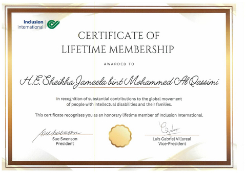 Sheikha Jameela bint Mohammed Al Qasimi ได้รับประกาศนียบัตรสมาชิกกิตติมศักดิ์ตลอดชีพจาก Inclusion International (ภาพ: AETOSWire)